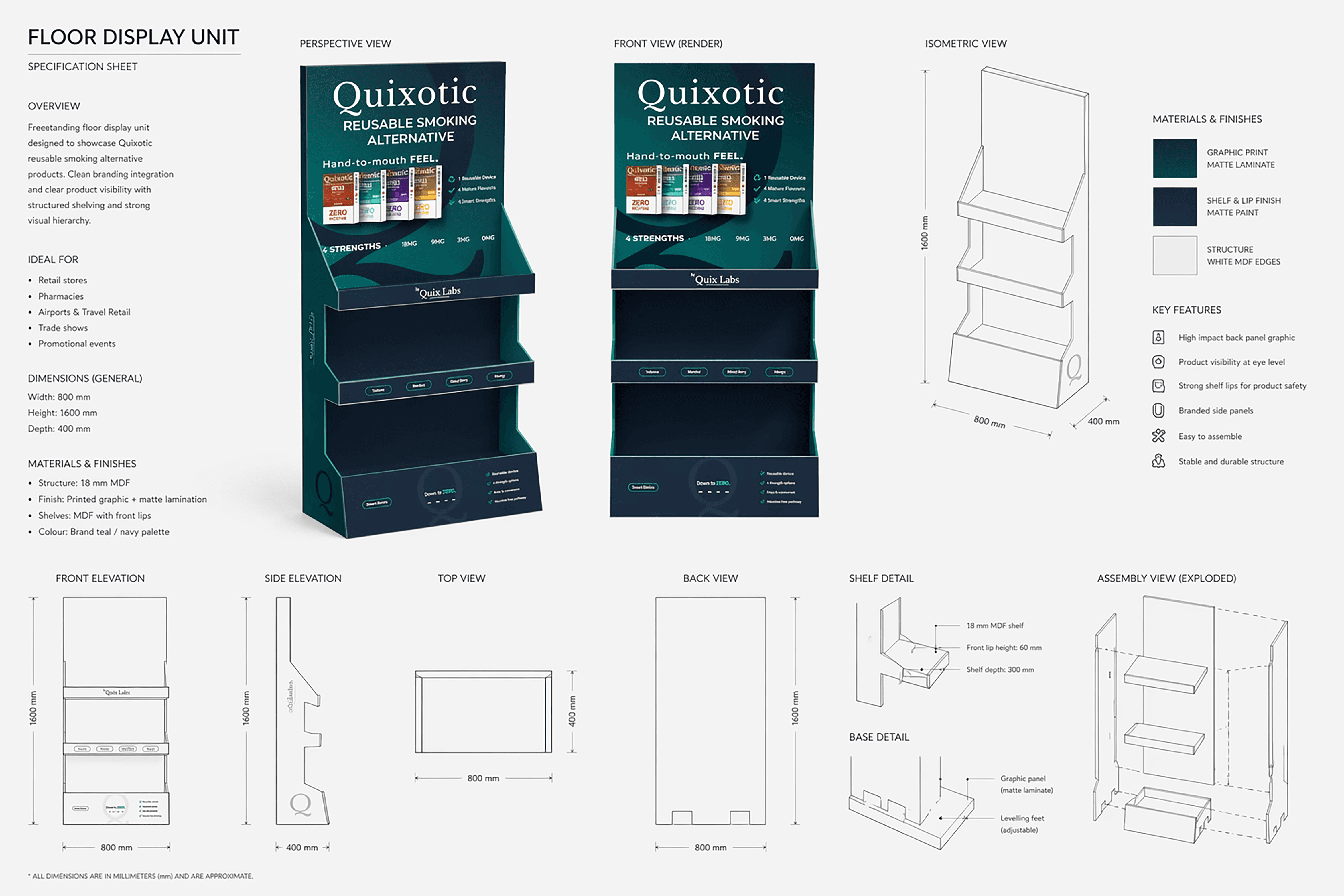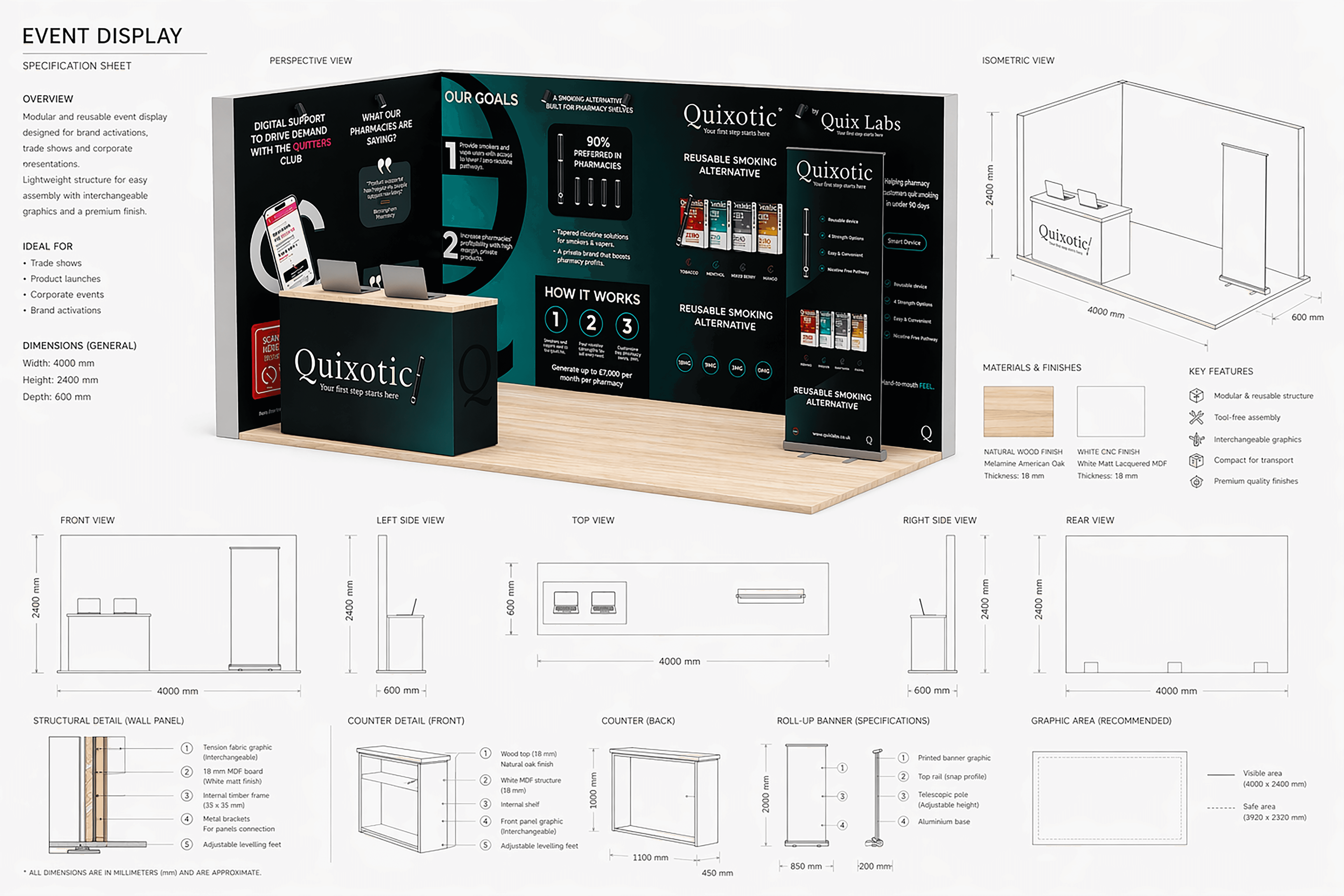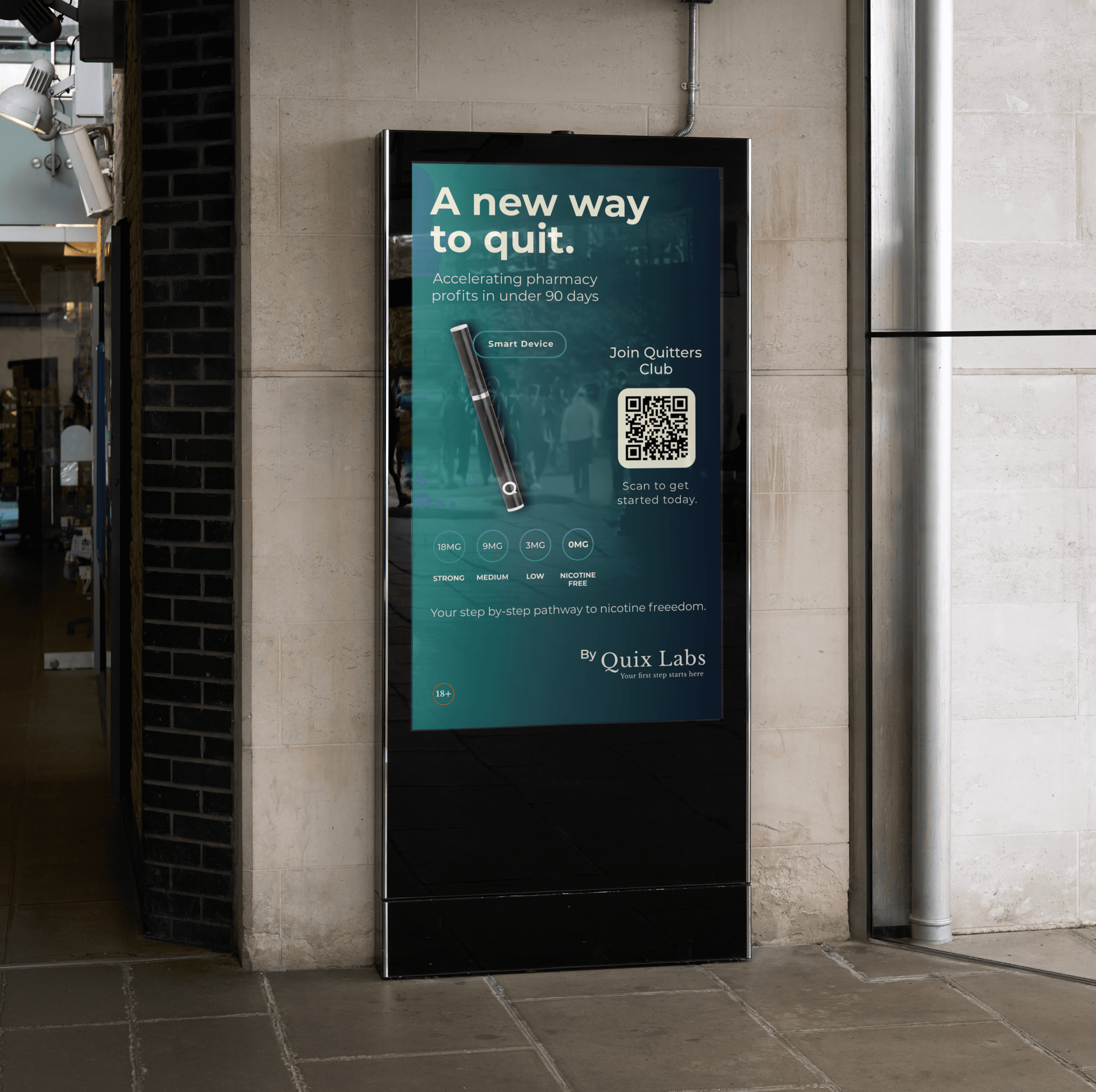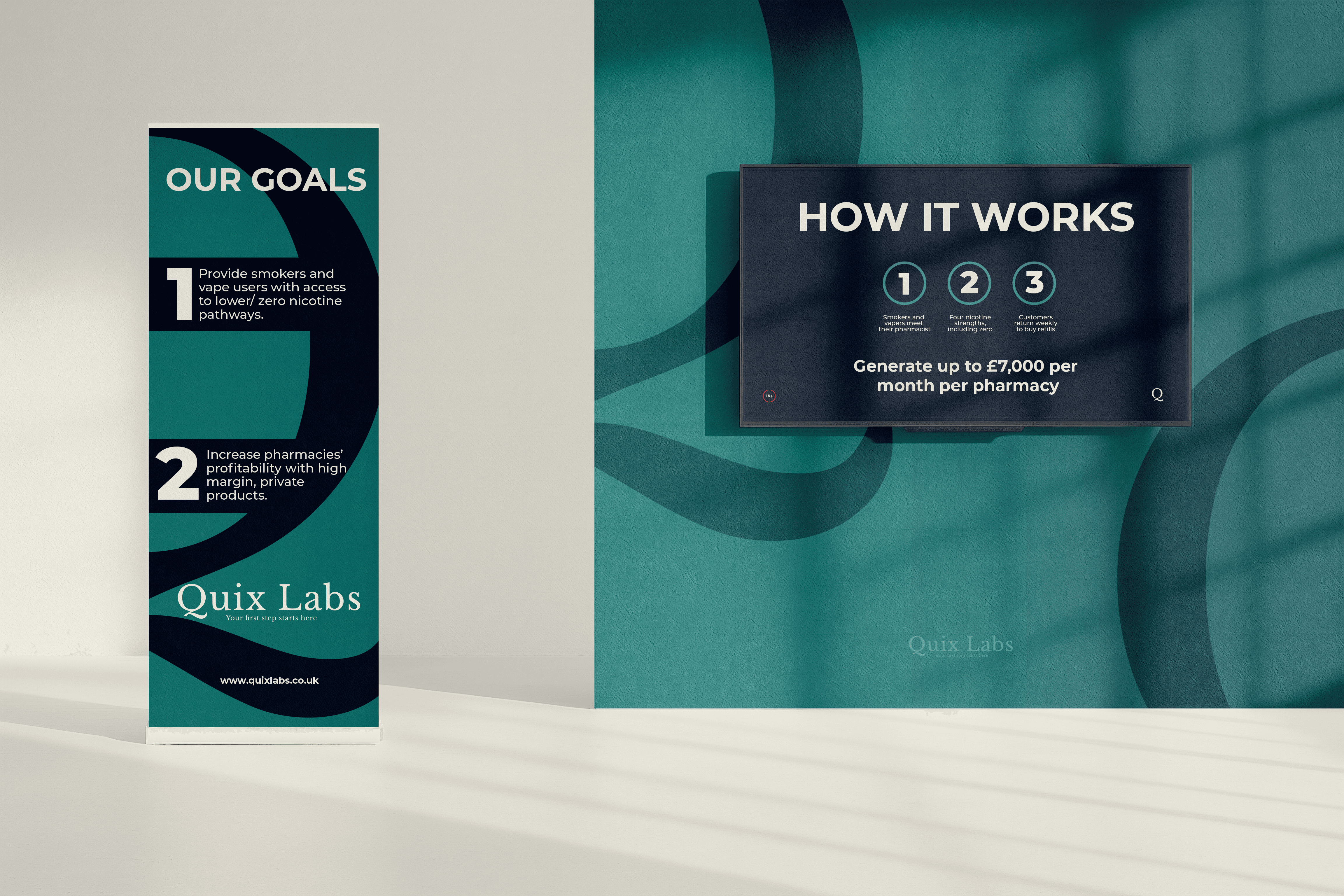 Brand identity and campaign development for Quix Labs, extended across digital, print and spatial applications. The project includes visual system design, communication assets and physical display structures, creating a consistent brand presence across multiple touchpoints.